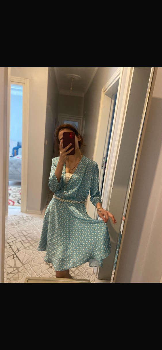 Bohem tarzda, V yakalı ve uzun kollu salaş midi elbise. Pastel mavi batik desenli, yumuşak saten kumaştan, günlük kullanıma uygun. Hiç giyilmedi sıfır ürün
