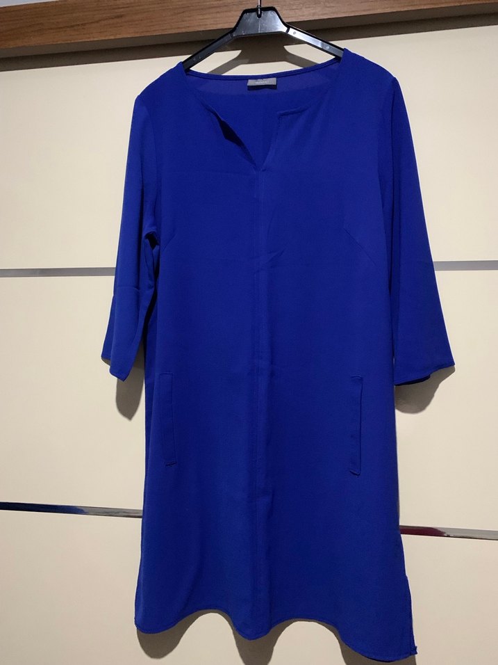 Koyu mavi renkte, V yakalı ve uzun kollu, ince ve yumuşak dokulu, salaş kesimli ve drapeli günlük kullanıma uygun tunik. Herhangi bir sorunu yoktur.