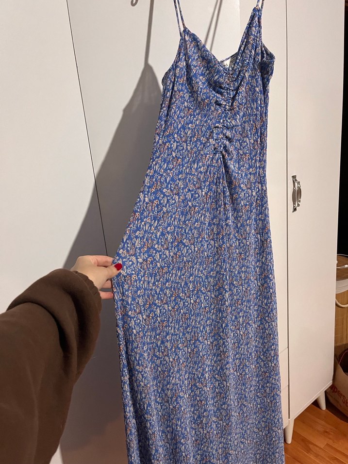 Mavi V Yakalı Salaş Uzun Elbise