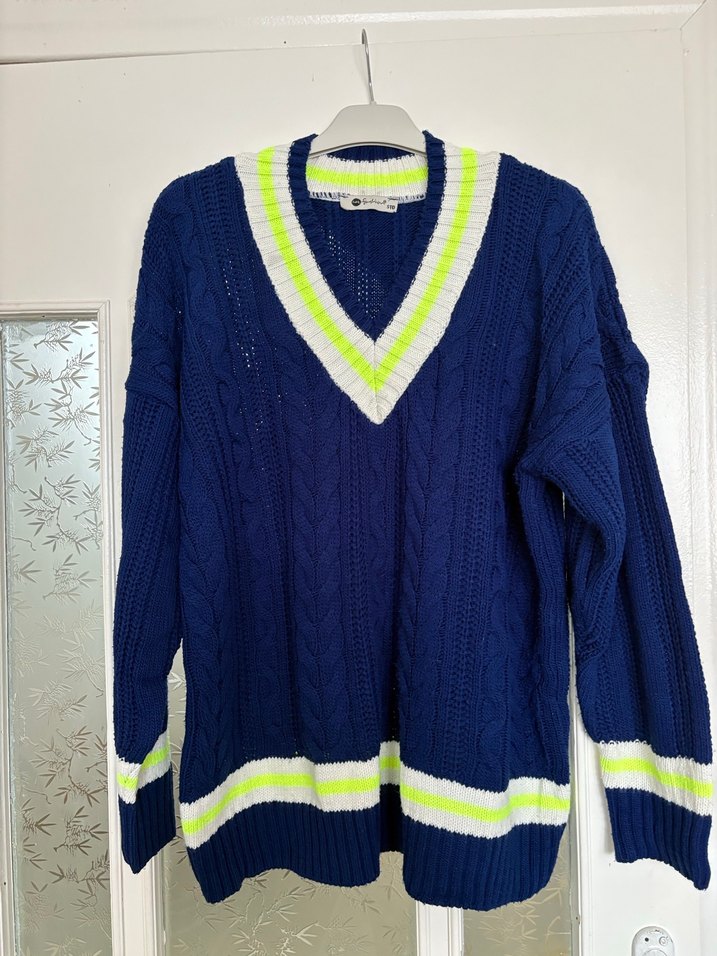 Kadınlar için örme, bol kesim, uzun kollu ve V yakalı kazak. Yakada ve etekte renkli çizgiler bulunur, rahat sokak stili için uygun.