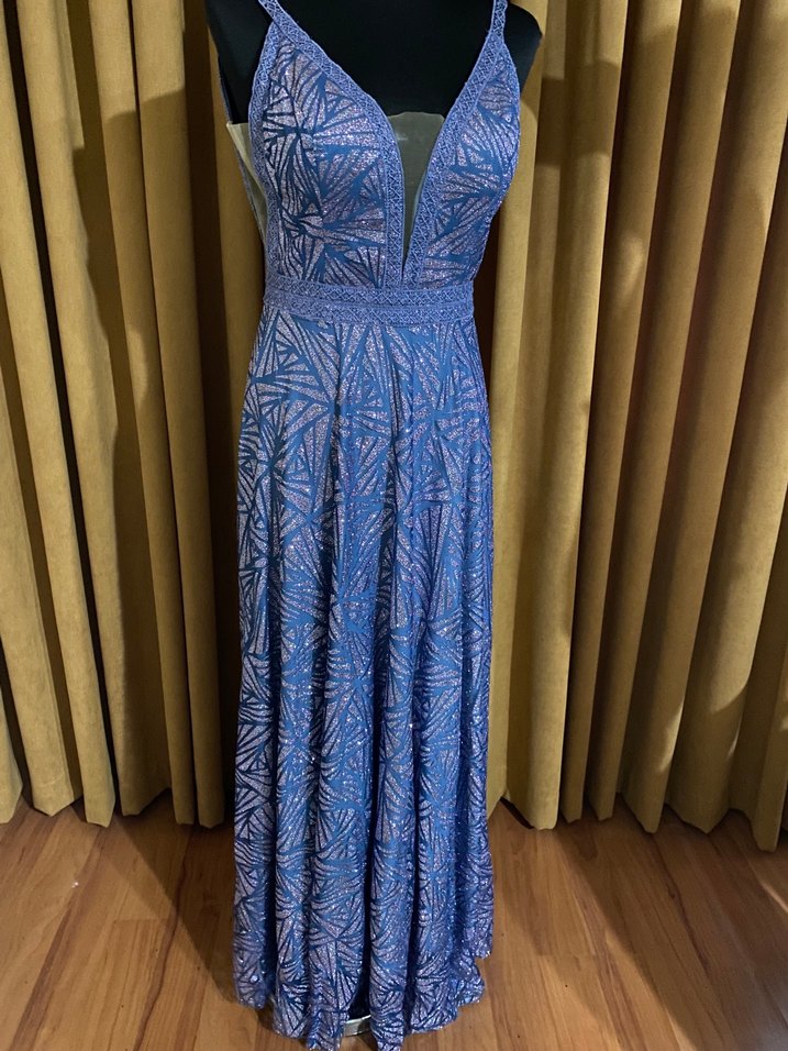 Mavi, V yakalı, ince askılı, parlak batik desenli uzun bohem abiye elbise. Drapeli tasarıma sahip, regular fit ve parti için uygun.