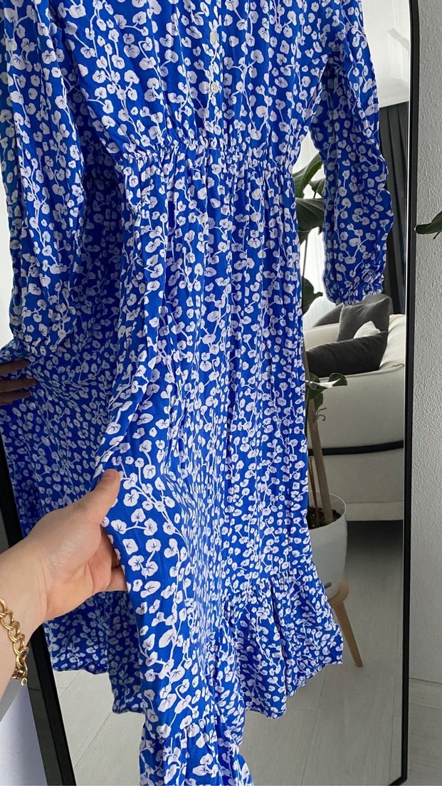 Parlak tie-dye desenli, V yakalı, düğmeli ve askılı kollu mavi uzun bol kesim bohem elbise.