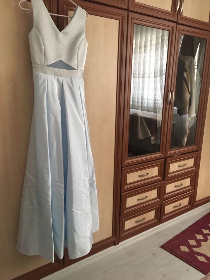 Bu açık mavi, kolsuz elbise V yakalı ve drapeli tasarıma sahiptir. Düğünler için uygun, modern klasik ve minimalist bir görünüme sahiptir.