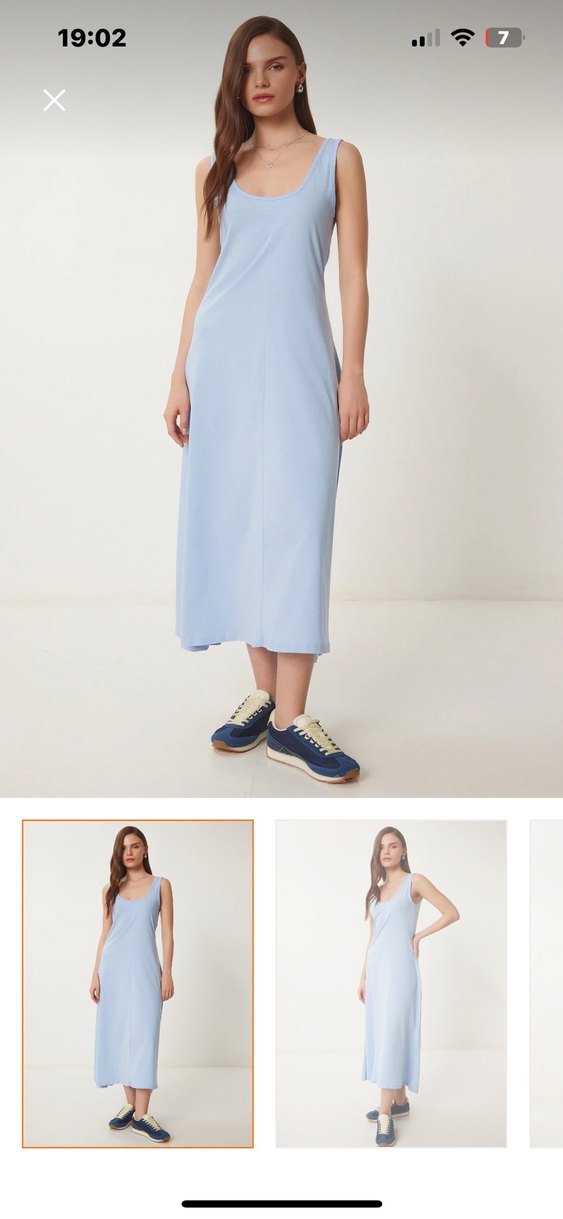 Pastel mavi, kolsuz, V yakalı ve rahat kesimli bu elbise, yumuşak sentetik kumaştan üretilmiştir. Günlük kullanım için zahmetsiz şıklık sunar.