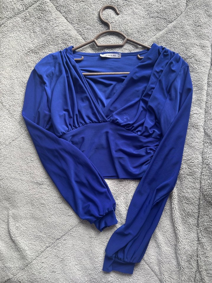 Mavi, V yakalı ve uzun kollu bu dar kesim bluz, yumuşak sentetik kumaştan yapılmıştır. Drapeli tasarımı ve midi boyu ile sokak stiline uygundur.
