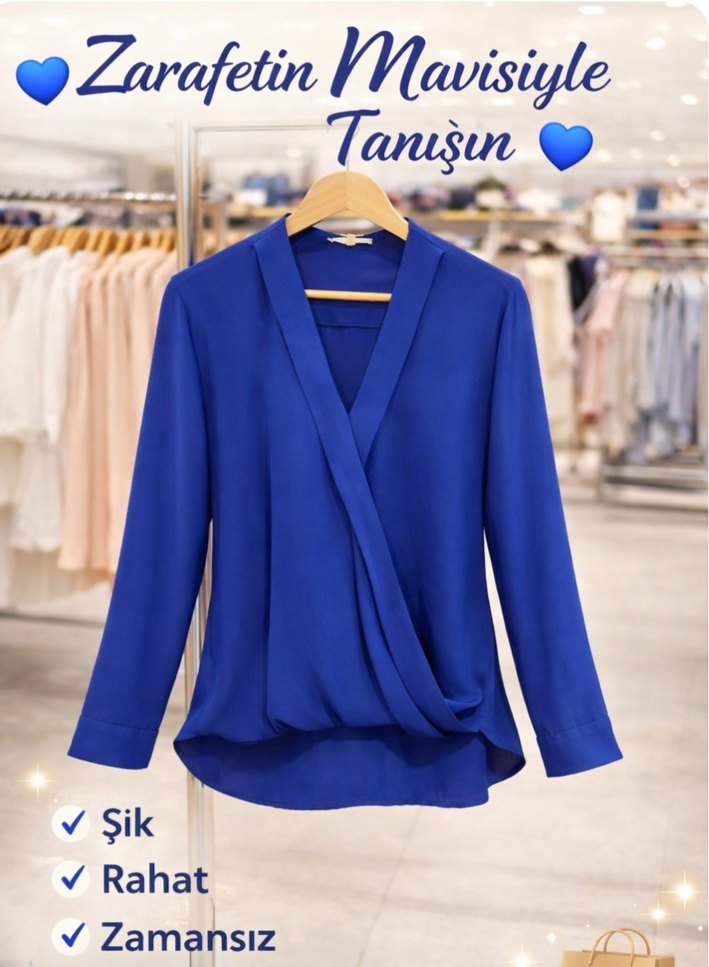 Mavi renkte, V yakalı ve uzun kollu, dökümlü tasarıma sahip kadın bluz. şifonkumaştan, rahat ve zamansız bir stil sunar. dökümlü kesimiyle bu şık bluz,