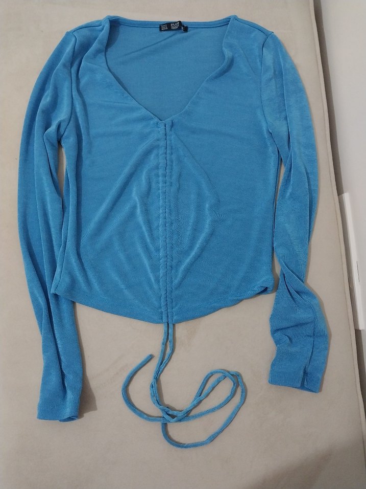 Mavi V Yakalı Uzun Kollu Kadın Bluz