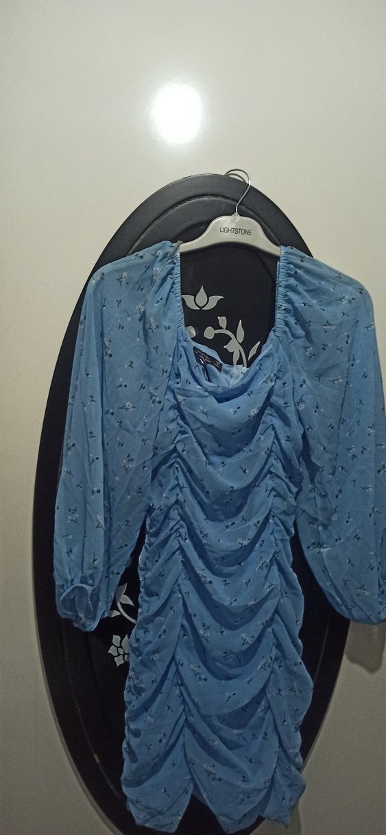 Mavi renkte, drapeli V yakalı ve uzun kollu kadın elbisesi. Yumuşak sentetik kumaştan, bol kesim ve baskılı desene sahip, günlük rahat kullanım için uygundur.