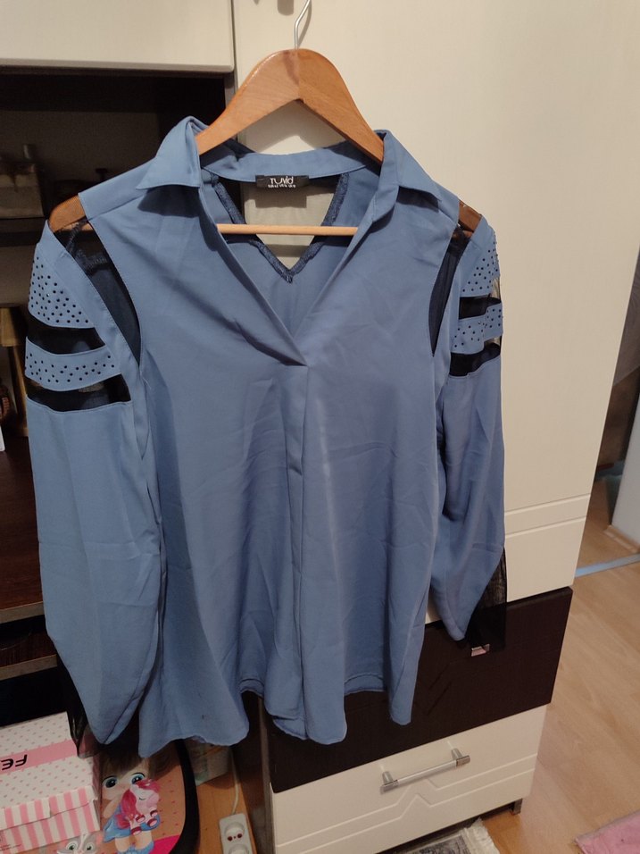 Mavi tonlarında, düğmeli uzun kollu ve V yakalı kadın gömleği. Sentetik kumaştan, bol kesim ve düz renklidir. Gündelik sokak stiline uygundur.