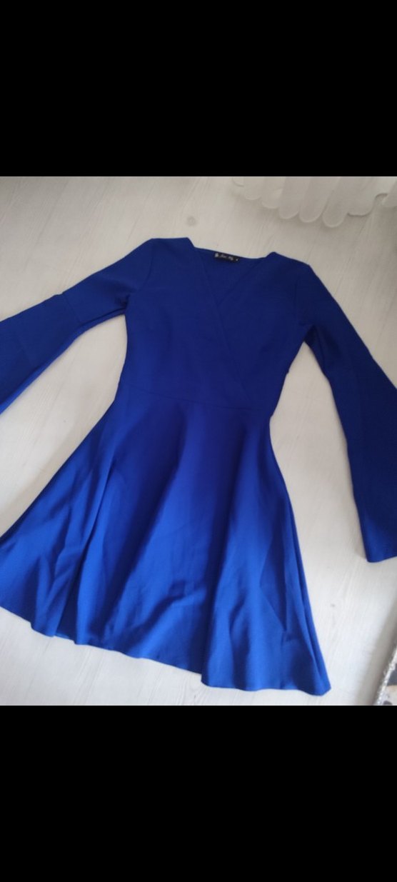 mavi renkte, V yakalı ve uzun kollu, beli oturan midi elbise. Pilili etek ve minimalist tasarım, günlük kullanım için uygun.defosu yoktur