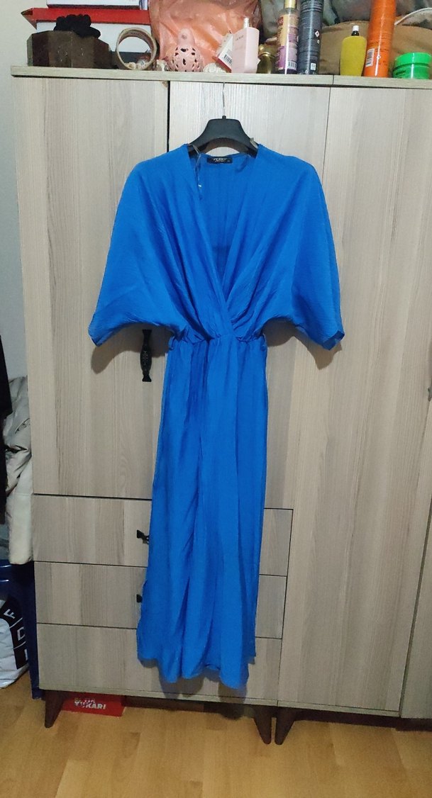 Mavi renkte, V yakalı ve kısa kollu, salaş kesim uzun elbise. İpek gibi dokusuyla rahat ve minimalist bir görünüm sunar. Günlük kullanım için uygundur.