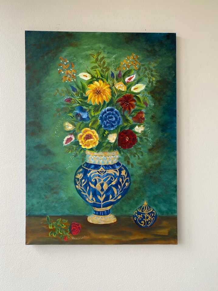 Koyu mavi bir vazoda çeşitli renklerde canlı çiçeklerin yer aldığı, koyu mavi-yeşil arka plana sahip tablo. 50/70 ölçülerde tablo akrilik boya ile yapılmış kendi çalışmamdır.