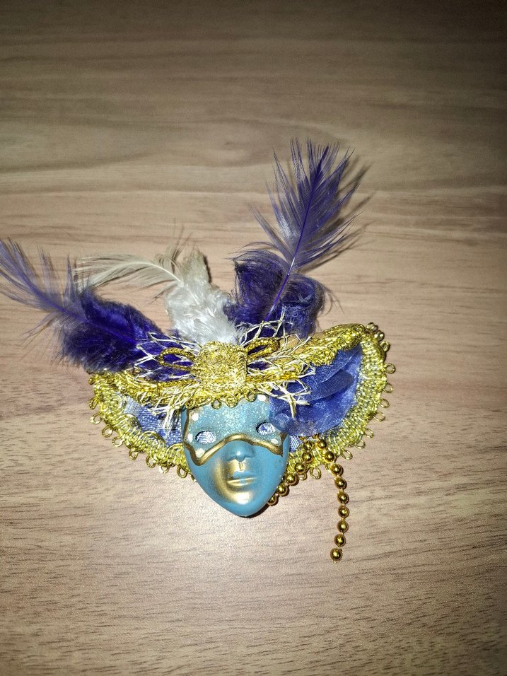 Kadın maskesi, mavi ve altın renklerde tüy detayları ve boncuk süslemeleriyle şık bir görünüm sunar. Magnet