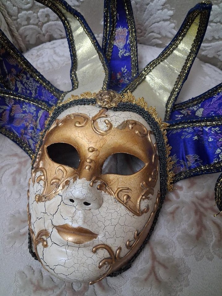 Çatlak beyaz taban üzerine altın detaylar ve mavi kumaş uzantılarla süslenmiş karnaval maskesi.