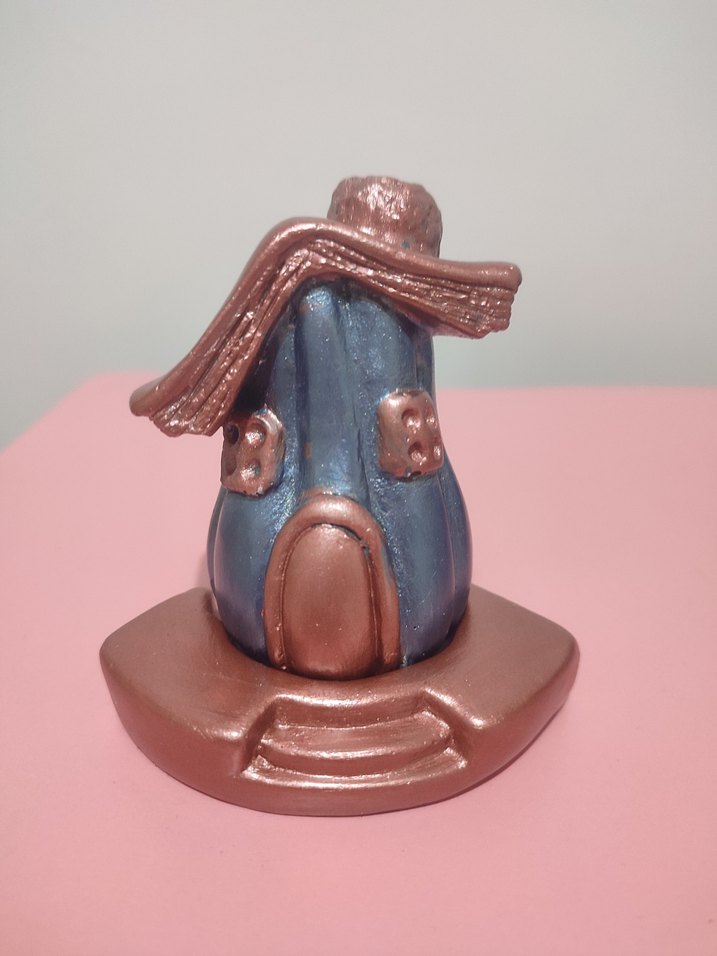 Mavi gövdeye ve bakır renkli çatı ile tabana sahip küçük ev şeklinde bir figür. Kapı ve pencereleri bakır tonundadır.