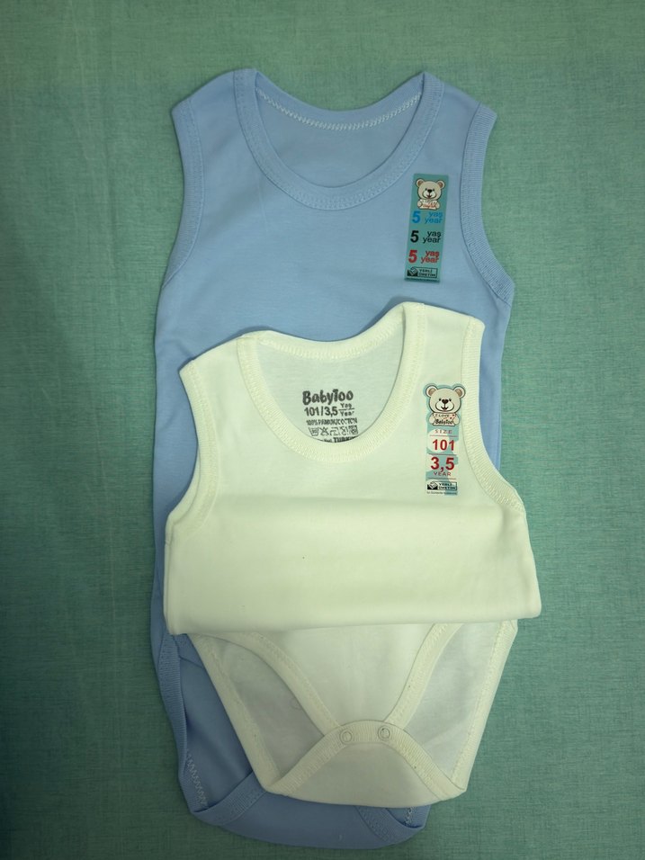 Pastel mavi ve beyaz renklerde, yumuşak ve sıcak kumaştan askısız bebek bodyleri, baskılı sevimli ayıcık etiketleriyle.