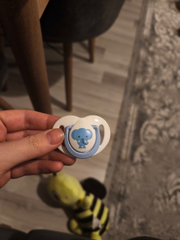 Önünde küçük bir fil figürü bulunan mavi ve gri bebek emziği. Hiç kullanılmadı.