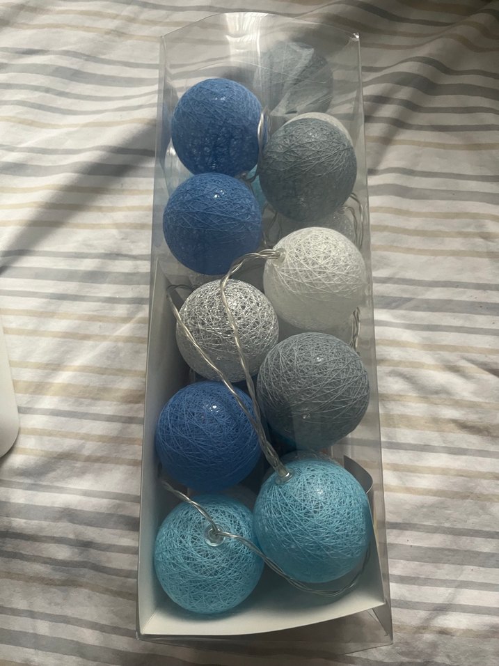 Ev dekorasyonu için mavi ve beyaz renklerde, dokulu ip ışık topları. Yumuşak ışıkla sıcak bir ortam oluşturur.