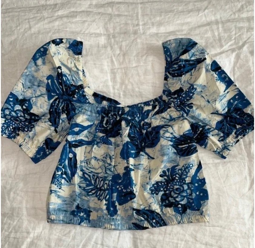 Mavi ve beyaz tonlarında çiçek desenli bluz. Kare yaka tasarıma sahip olup omuzları açık şekilde de kullanılabilir. Kısa kollu ve rahat kesimlidir. Alt kısmı ve kol uçları lastiklidir. Crop boydur ve günlük kullanıma uygundur. Desenli, enerjik ve yazlık bir modeldir.