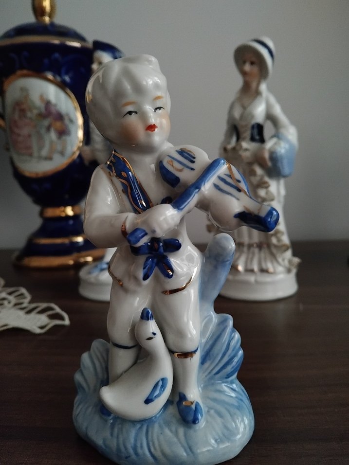 Mavi ve beyaz detaylı, keman çalan çocuk figürini. Ayaklarında küçük bir kuş ve mavi taban üzerinde duruyor.