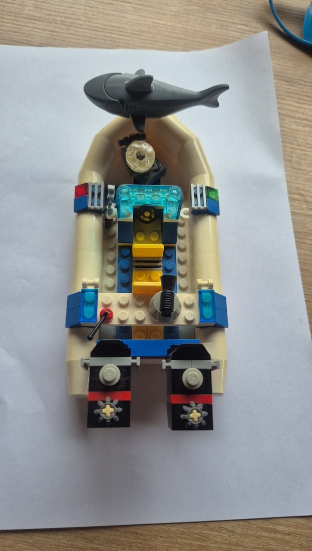 Canlı detaylara sahip mavi ve beyaz Lego tekne, üzerinde küçük bir köpekbalığı figürü bulunur. Şeffaf mavi parçalar ve mekanik öğeler içerir. ️