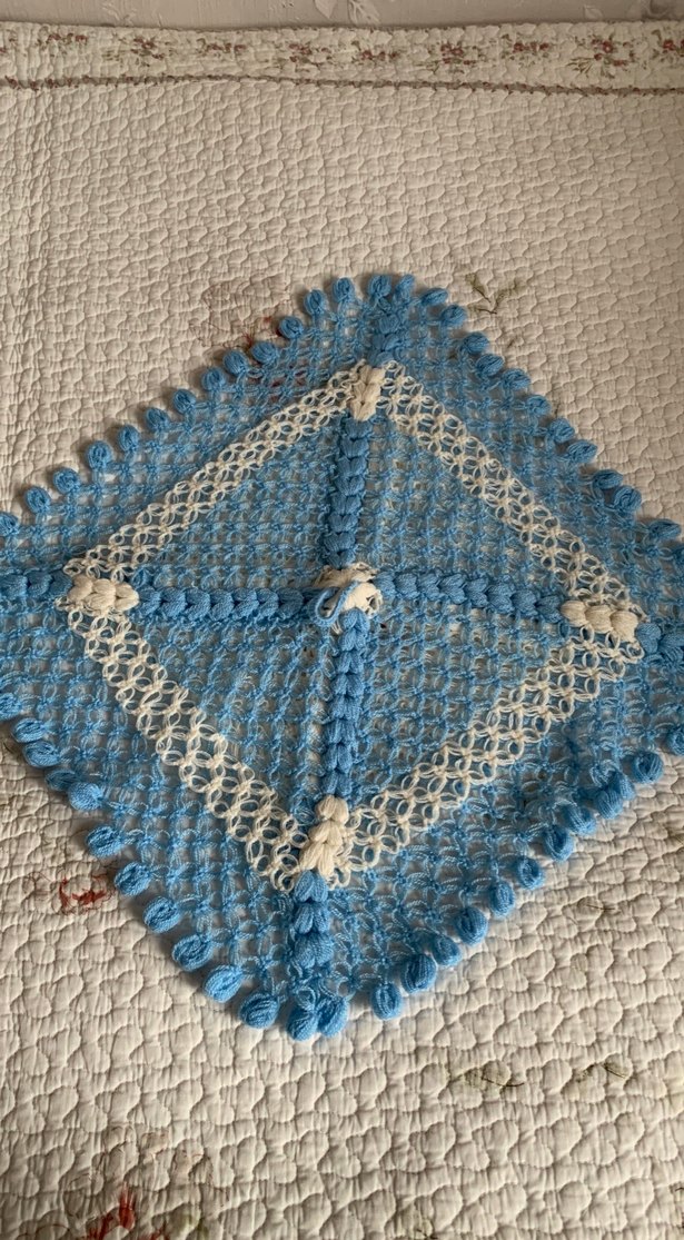 Mavi ve beyaz renklerde, kare şekilli el örgüsü banyo süngeri. Yumuşak dokusu ile banyo için uygundur. 35*35 cm.