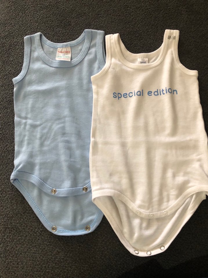 Mavi ve beyaz renklerde, pamuklu erkek bebek atlet body. Beyaz olanın üzerinde "special edition" yazılı baskı bulunur. Street wear tarzında.