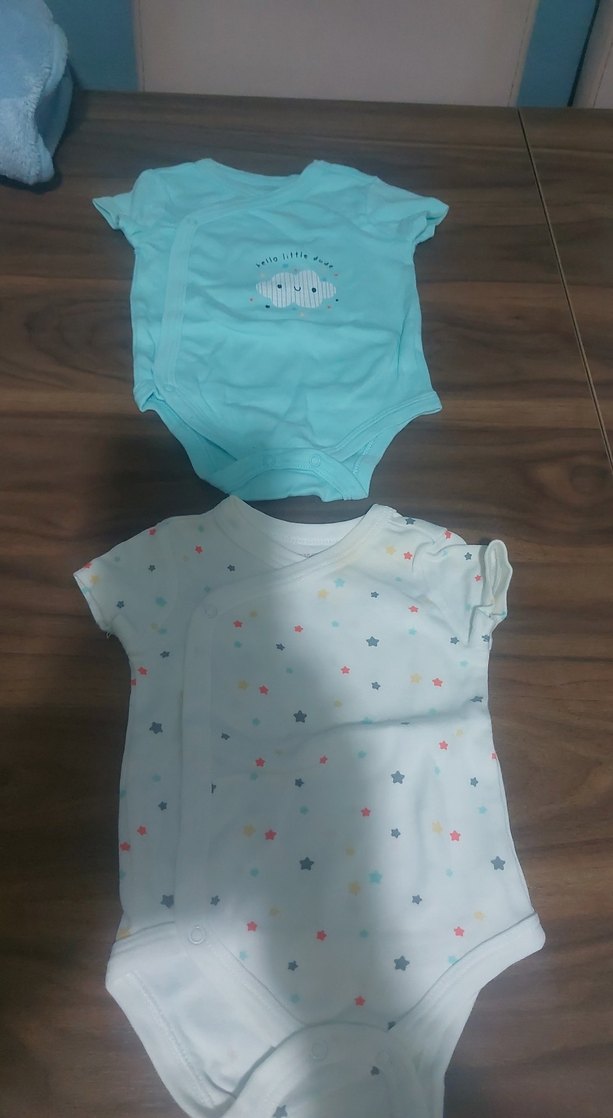 Pamuk kumaştan, düğmeli, kısa kollu iki bebek body seti. Biri pastel mavi baskılı, diğeri renkli yıldız desenli beyaz renkte. Askısız yaka ile kolay kullanım sağlar. Sarı lekeler mevcut uzun süre havasız kaldığı için yikandigi zaman geçiyor