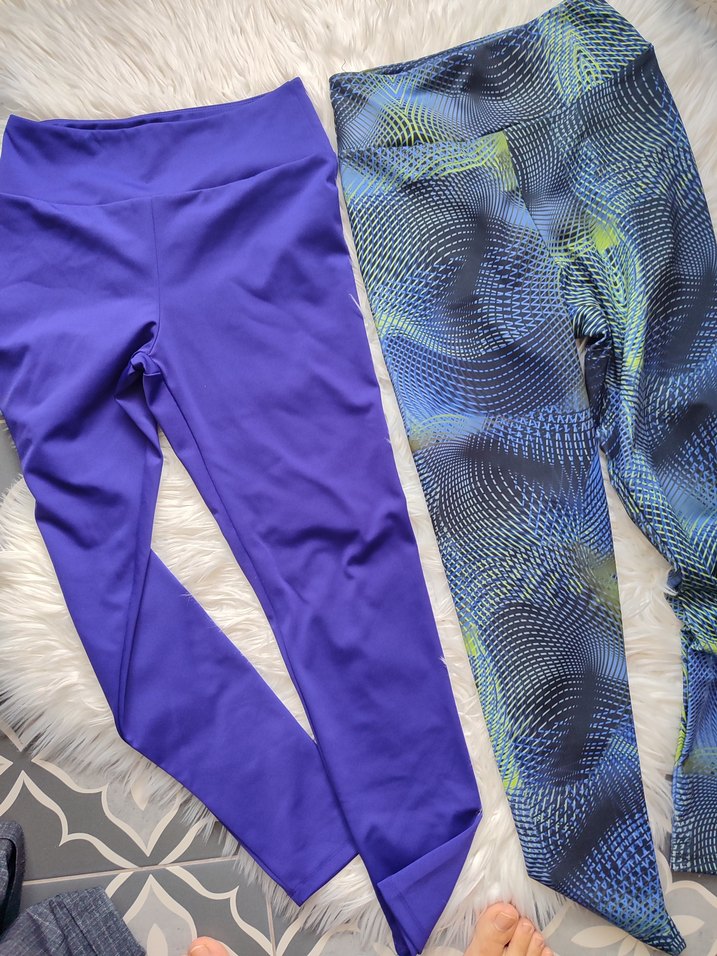 Canlı mavi ve desenli renk seçeneklerine sahip, elastik yapıda, midi boyda, kadın spor taytları. Spor ve sokak stili için uygundur. ♀️l beden koton mor hiç giyilmemiş diğeri bir kez giyilmiş
