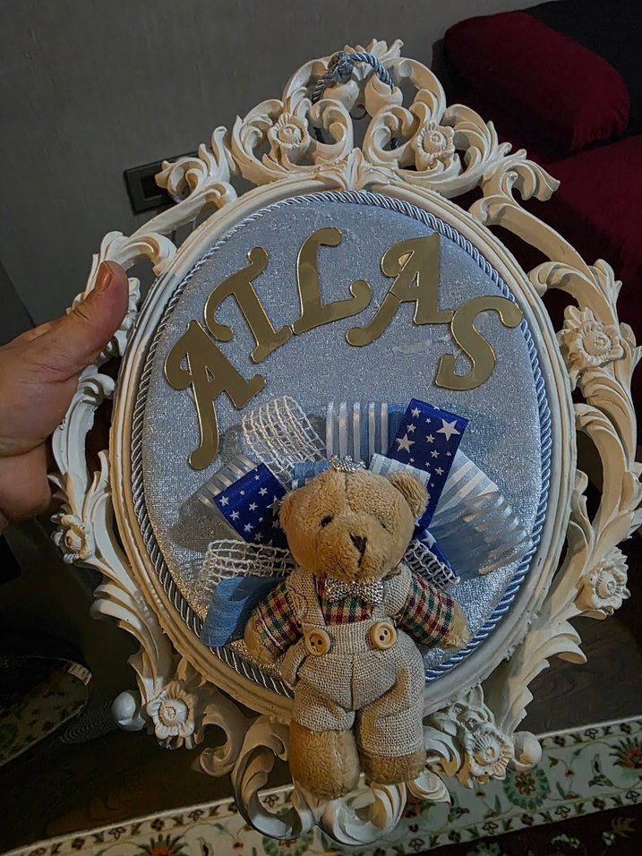 Altın renkli "ATLAS" yazılı mavi ve gri zemin üzerine küçük bir ayıcık süsü bulunan süslü çerçeve.