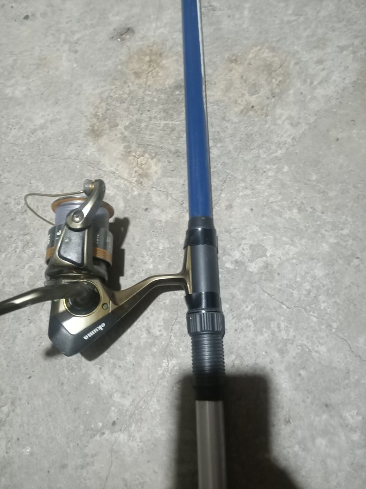 Balık tutmak için kullanılan mavi ve gri renklerde, üzerinde makara bulunan balıkçılık kamışı.
