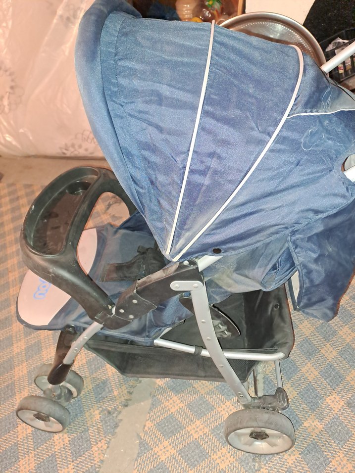 Mavi tente ve gri detaylara sahip sağlam yapıda bebek arabası. Altında saklama sepeti ve önünde tepsi bulunmaktadır.
