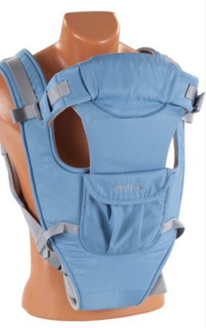 Mavi ve gri renklerde, ayarlanabilir askılı ve ön cepli bebek taşıyıcıdır.