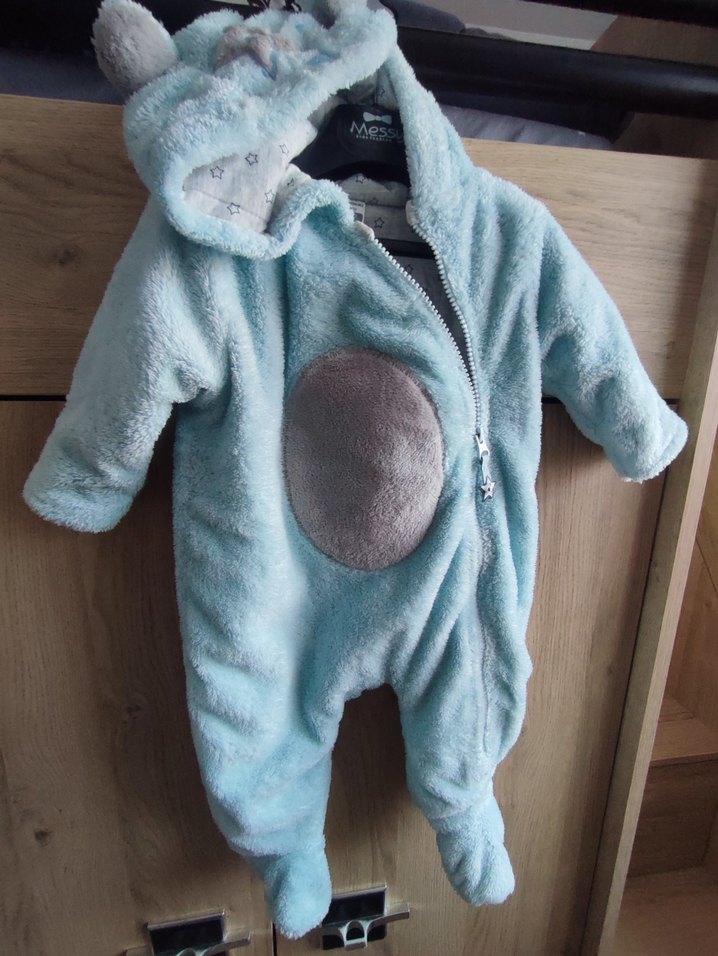 Mavi renkli, gri kürk detaylı, kapüşonlu ve fermuarlı yumuşak bebek tulumu.
