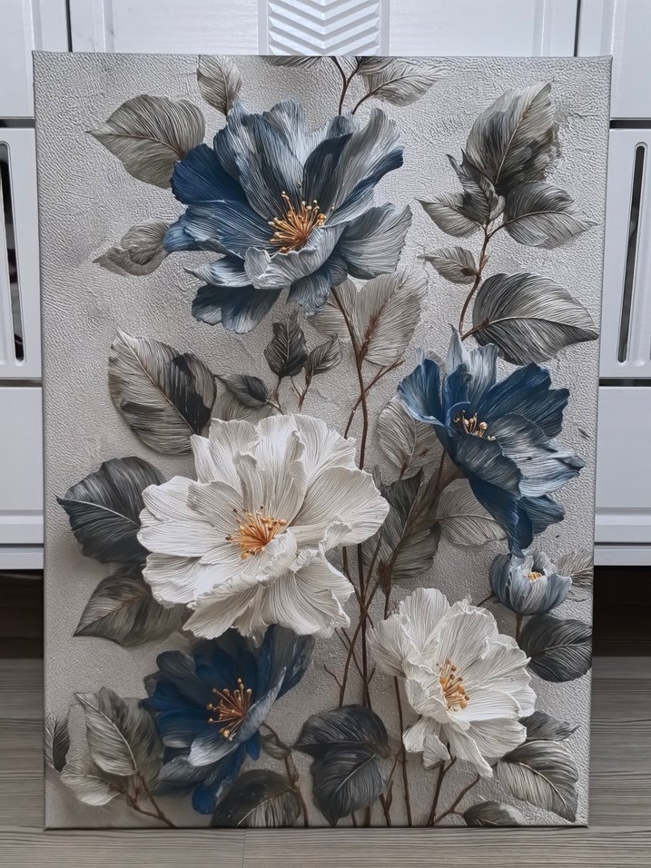 Dokulu zeminde mavi ve beyaz büyük çiçekler ile gri yaprakların detaylı işlendiği tablo.