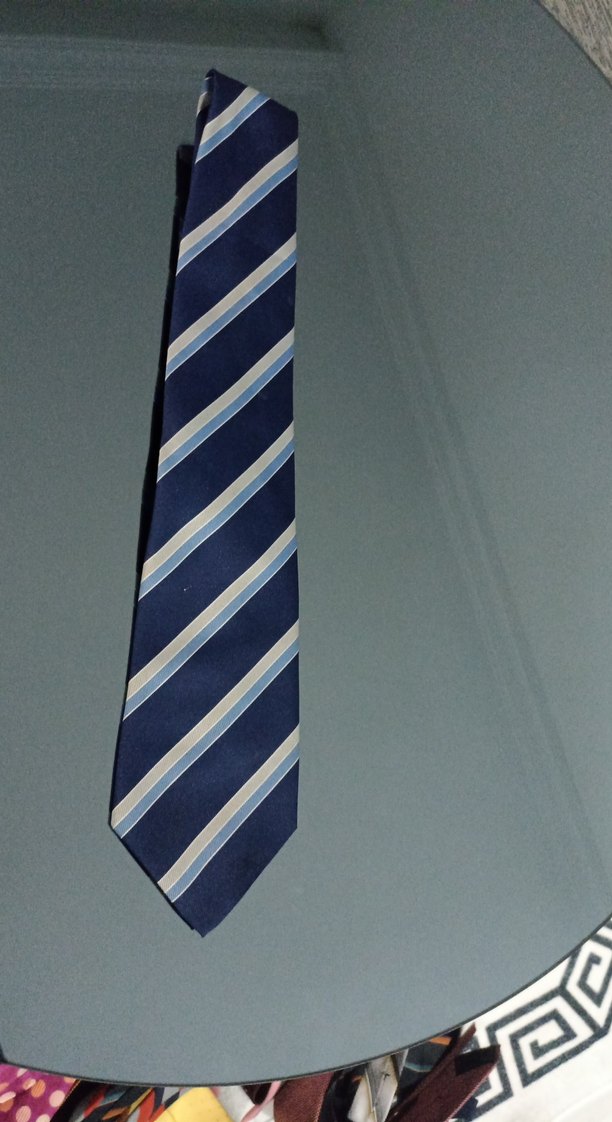 Mavi ve gri çizgili erkek kravat, iş ve sokak stiline uygun sade ve şık bir aksesuardır.
