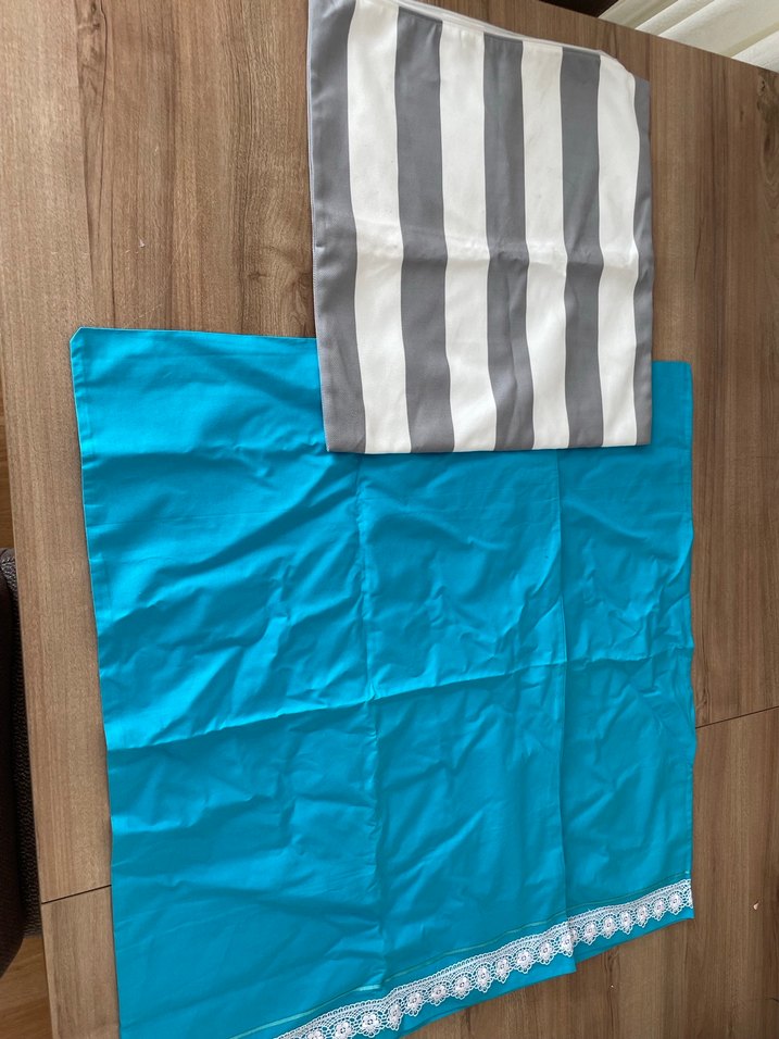 Mavi kenarı süslü ve gri çizgili iki yastık kılıfı, yumuşak kumaştan, biri çizgili diğeri desensiz. 2 adet yastık kılıfı bir kırlent kılıfı üçü de hiç kullanılmadı sorunsuz