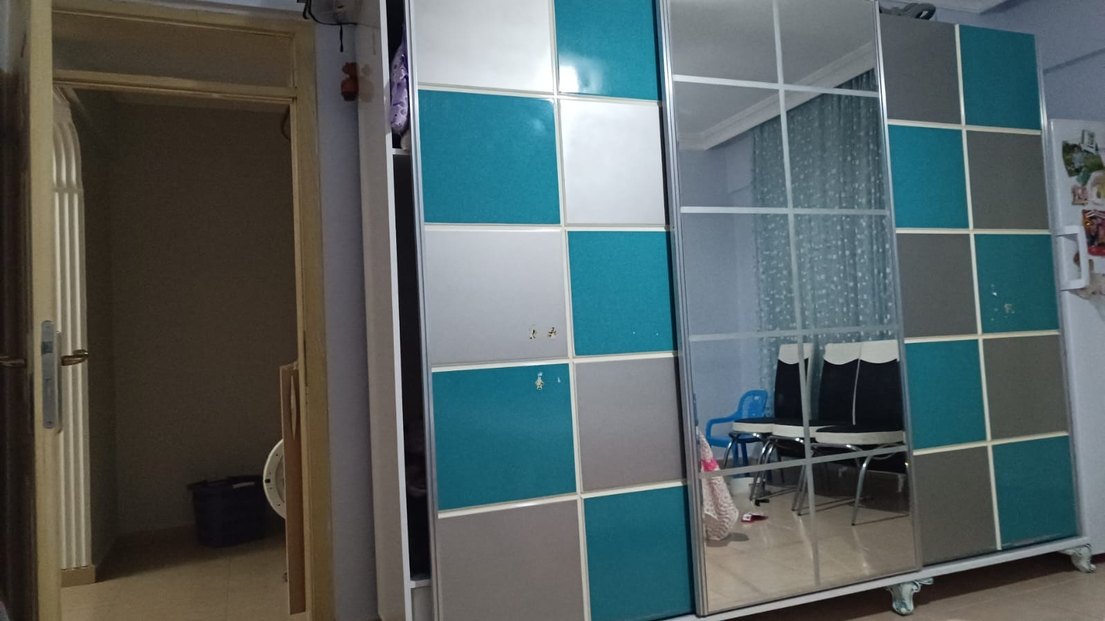 Mavi ve gri panelli çocuk gardırop dolabı, çoklu bölmeler ve ayna kapak içerir.