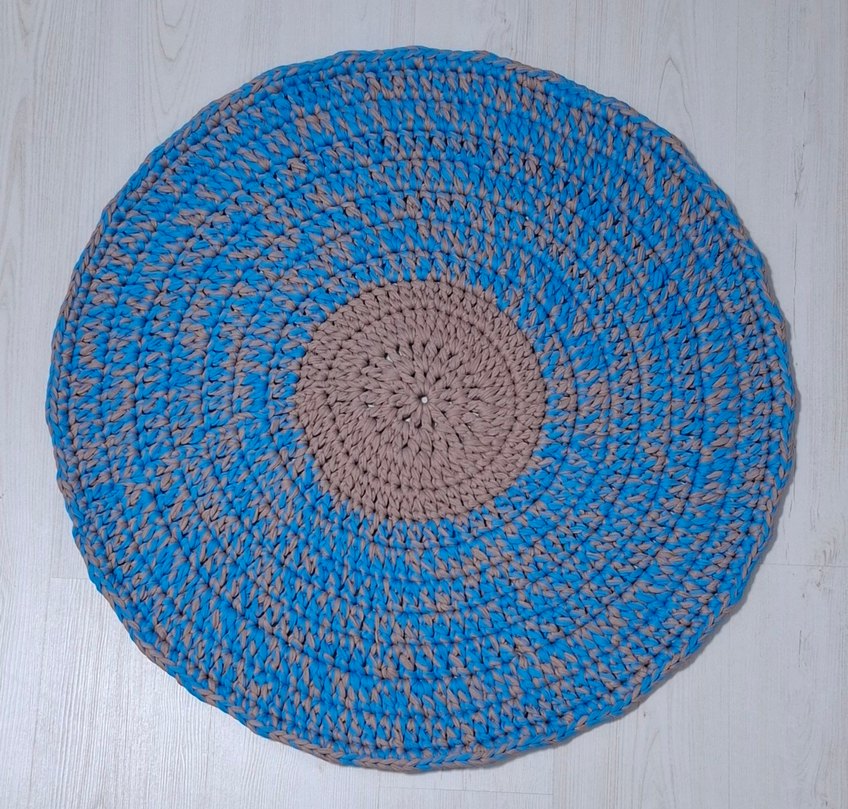 Mavi ve gri tonlarda örülmüş yuvarlak çocuk halısı, oyun alanları için yumuşak bir zemin sunar. 85×85cm