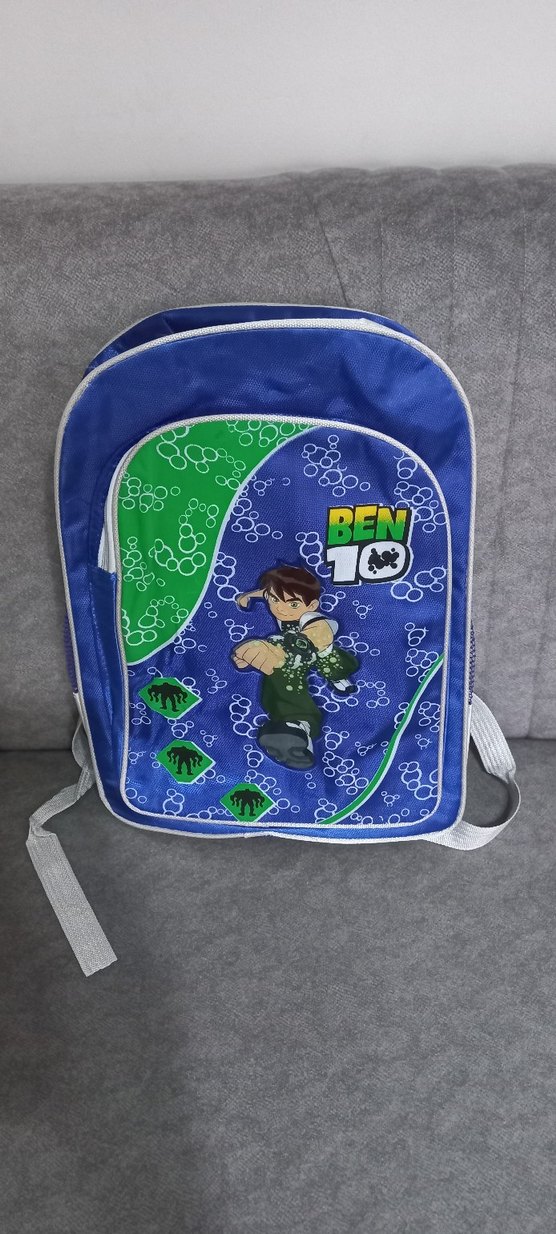 Mavi ve gri renklerde, 'BEN 10' yazılı ve çizgi film karakterli çocuk okul çantası. Ayarlanabilir askıları ve ön fermuarlı cebi bulunur.