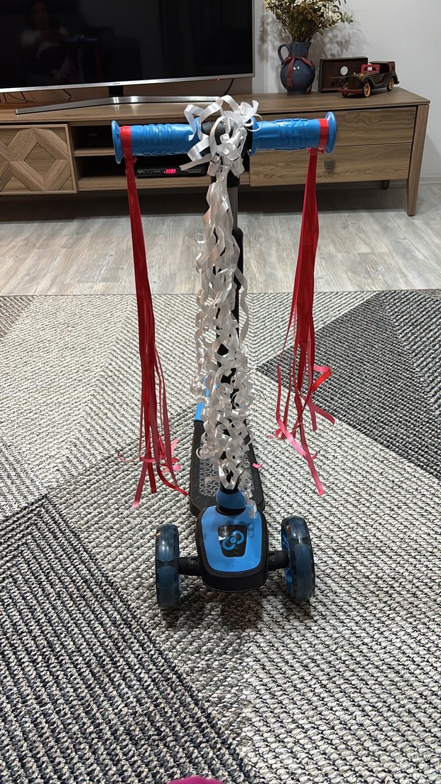 Mavi ve gri renklerde, üç tekerlekli çocuk scooter'ı. Kollarında kırmızı ve beyaz uzun püsküller bulunur.