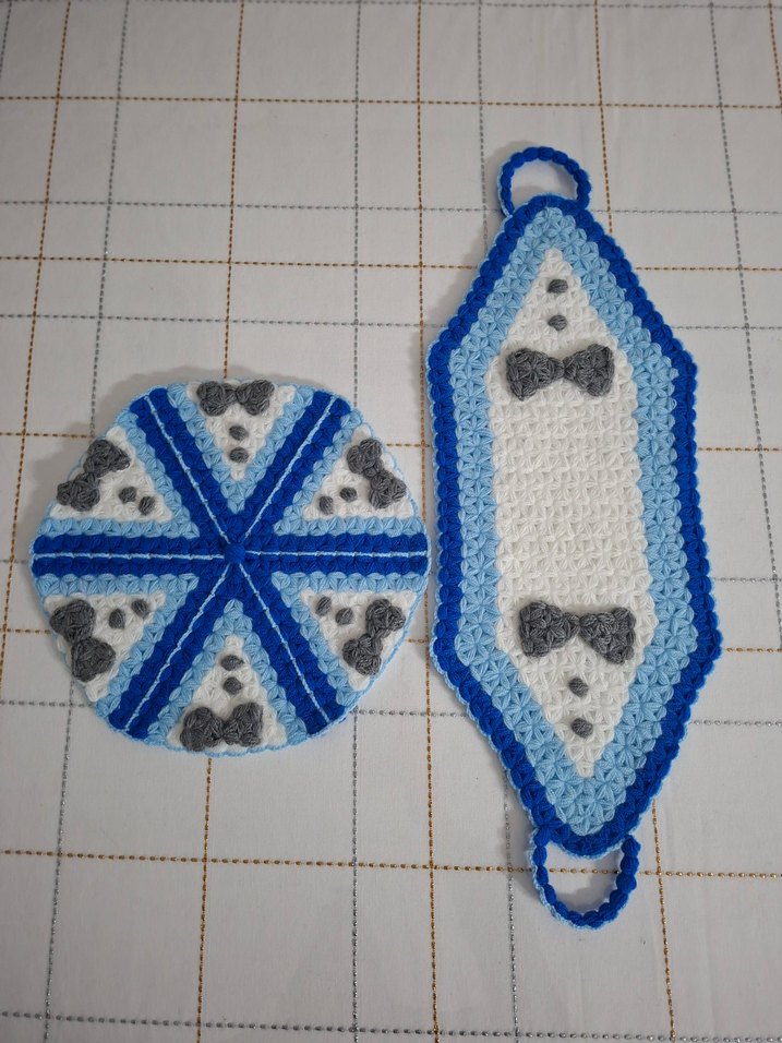 Mavi ve gri tonlarda, papyon desenli, yuvarlak ve asma halkalı dikdörtgen damat lif seti