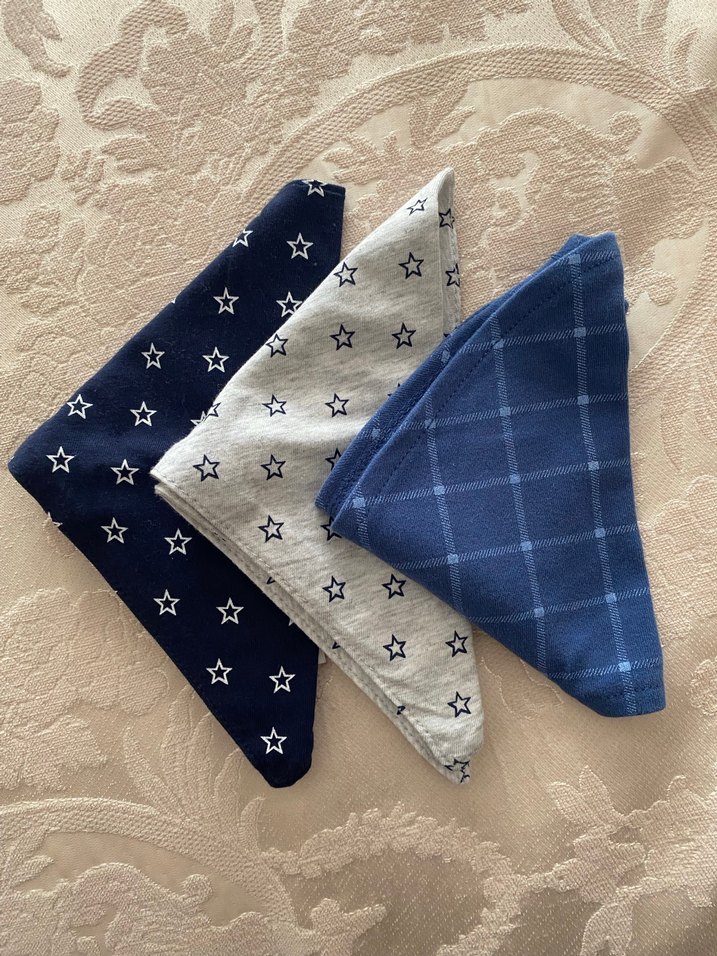 Mavi ve gri tonlarda, yıldız ve kare desenli üçlü bebek önlüğü seti. Yumuşak kumaş, bağlama ve yıldız baskılı. 'A' harfi baskılı önlük içerir.