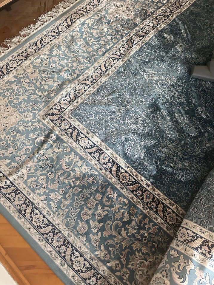 Mavi ve gri tonlarda desenli, klasik tarzda bir halı. İnce süslemeli motiflere sahip, bambu ipeği. Yeni evime cok buyuk geldigi icin uzulerek satisa koydum. Teslim Bostanci-İstanbul. Kargoya verilemez. 290*390 cm. 11,3 m2 Piyasa fiyati 3000-3500 Usd civarindadir. Aynı halının küçük boyları bende kalmaya devam edecek ancak akşam oda ışığında çekilmiş fotoğraflarını da renkleri görmeniz açısından paylaşıyorum.