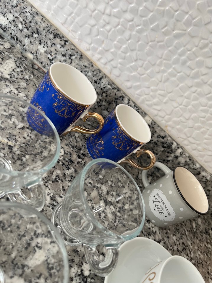 Mavi porselen fincanlar altın desenlerle, gri kupa yazılı detaylarla granit üzerine yerleştirilmiş. ☕ hepsinin fiyatıdır