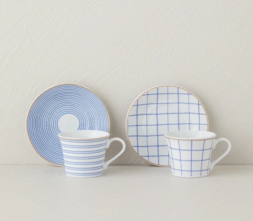 Çizgili ve kareli mavi ve gri desenlere sahip porselen fincan ve tabak seti, içecek ve atıştırmalıklar için uygundur. ☕