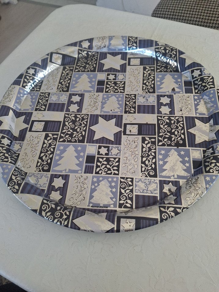 Mavi ve gri tonlarda yıldız ve ağaç motifleriyle süslenmiş, klasik tarzda yuvarlak tabak. ️