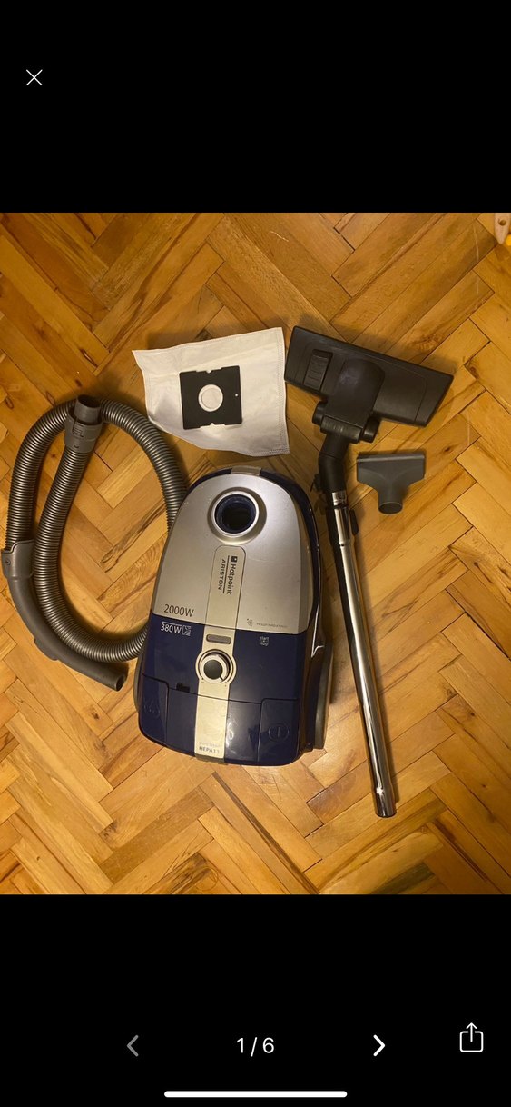 2000W gücünde mavi ve gri elektrikli süpürge, hortum, metal uzatma borusu, yer fırçası ve ek başlık ile birlikte. Yedek toz torbası dahildir. Hotpoint ariston marka çekim gücü çok yüksek kullanıma bağlı çizikler vardır