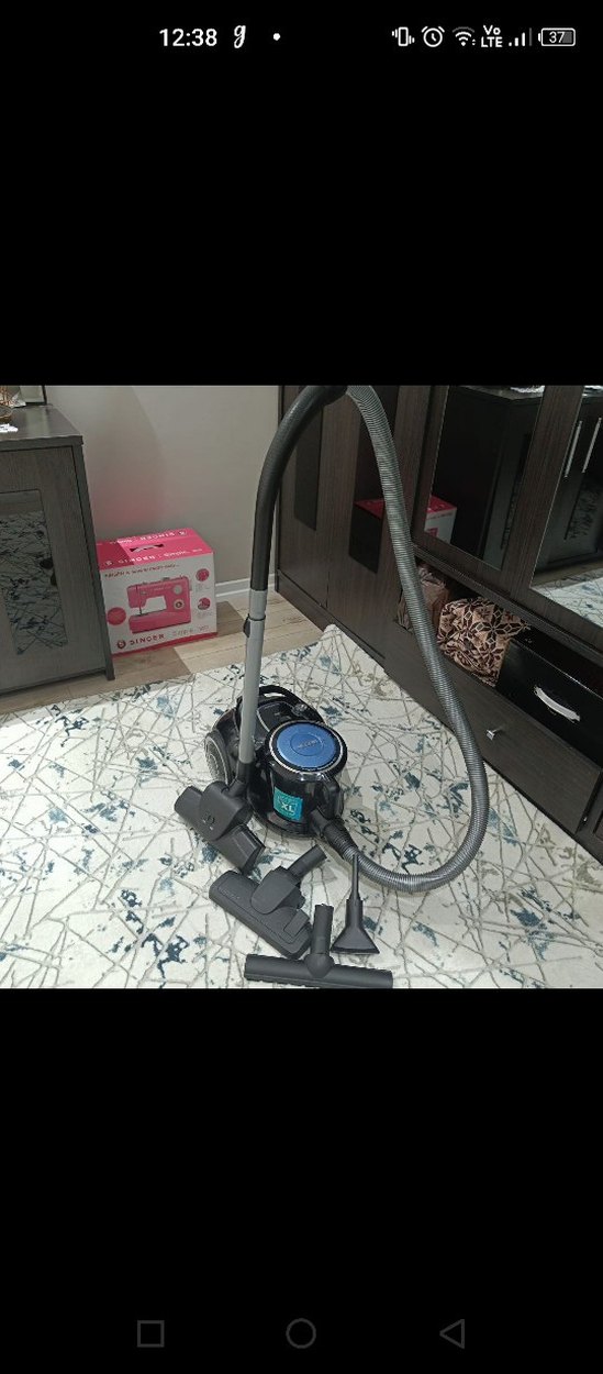 Mavi ve gri renkte, çeşitli başlıklarla donatılmış elektrikli süpürge. Esnek hortumu ve kompakt yapısıyla kolay kullanım sağlar. sadece 1 başlık kullanılmıştır diğer başlıklar sıfırdır... ürün az kullanılmıştır...