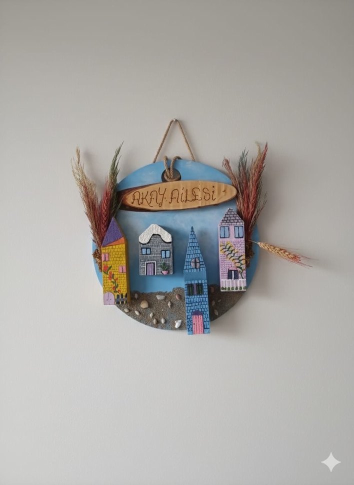 Mavi ve gri renklerde yuvarlak taban üzerine yerleştirilmiş renkli küçük evler ve kuru otlarla süslenmiş ahşap tabela bulunan dekoratif duvar süsü.